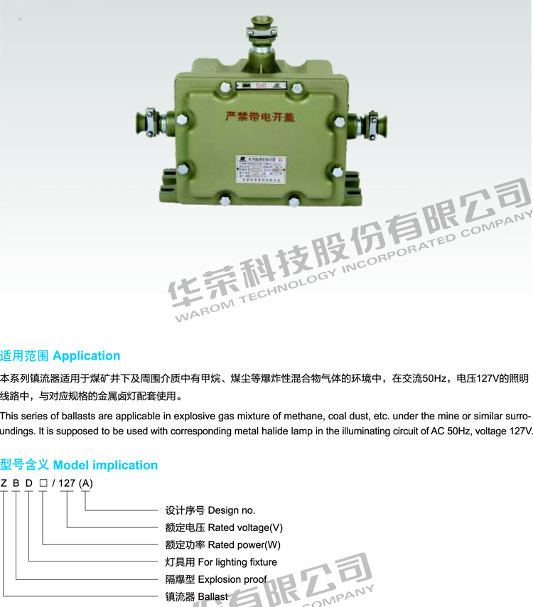 • 產(chǎn)品名稱:ZBD□?127(A)?礦用隔爆型鎮(zhèn)流器(金鹵燈)