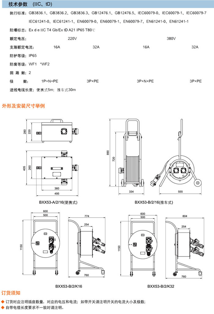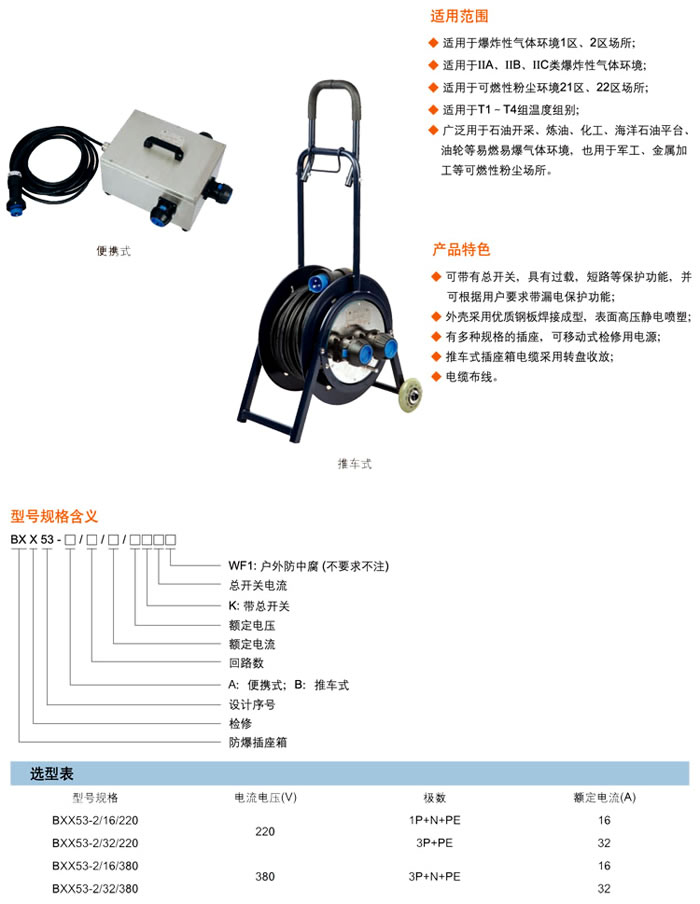 • 產(chǎn)品名稱:BXX53系列防爆移動檢修電源插座箱(ⅡC、tD)